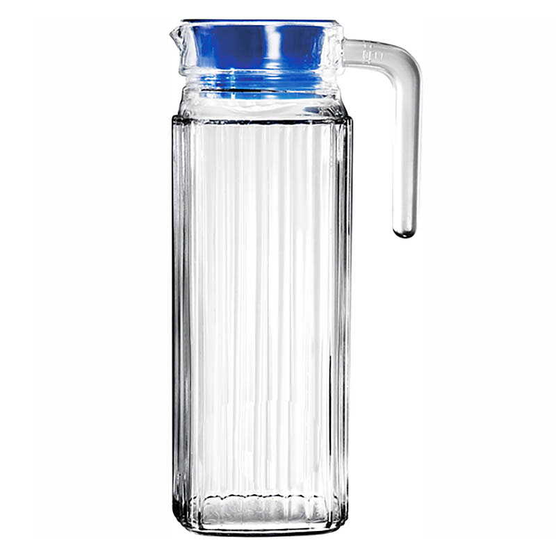 Tillbringare i glas med plastlock. Rymd 1 L. Höjd 240 mm. Botten 80 x 80 mm.