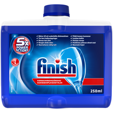 Diskmaskinrengöring finish rengör effektivt din diskmaskin. Diskmaskinrengöringen tar även bort fett och kalkavlagringar som bildas under användning. För bästa resultat använd en gång i månaden. 250ml
