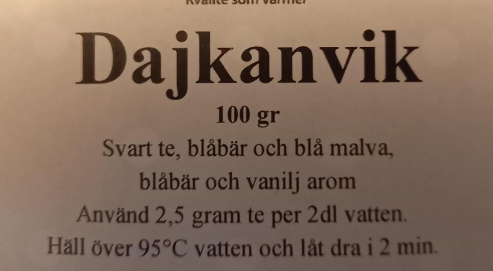 Svart te, blåbär och blå malva, blåbär och vaniljarom. Använd 2,5 gram te per 2dl vatten. Häll över 95grader vatten och vatten och låt dra i 2min.