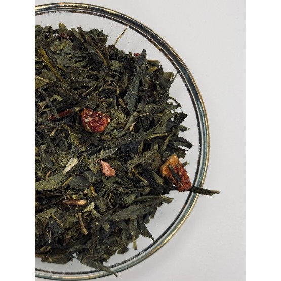 Grönt te med fläderbär, kattfotsblom, lakritsrot, hallonbitar, jordgubbsbitar och arom.