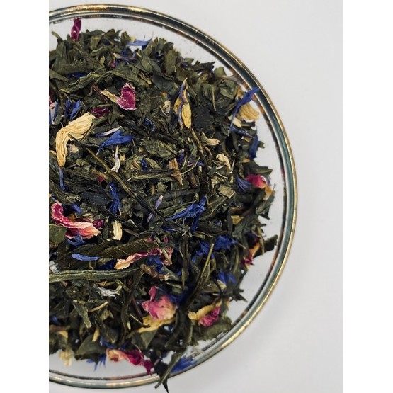 Grönt te, solrosblommor, blåklint, rosenblad och arom.