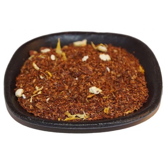 Rooibos, apelsinskal, ringblommor, äppelbitar och arom av mandarin, persika och äpple.